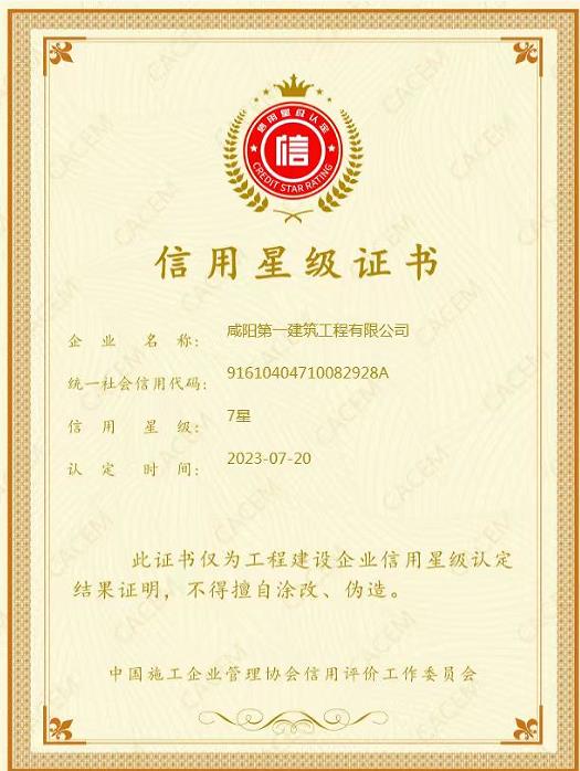為加快推動(dòng)工程建設(shè)行業(yè)信用體系建設(shè),中施協(xié)下發(fā)了《工程建設(shè)企業(yè)信用星級(jí)管理辦法》文件,并組織開展2023年工程建設(shè)行業(yè)“誠信授星活動(dòng)”。我公司按文件要求積極申報(bào),經(jīng)過陜西省建筑業(yè)協(xié)會(huì)推薦,中國施工企業(yè)管理協(xié)會(huì)的層層嚴(yán)格評(píng)選,于2023年7月20日正式公布評(píng)定結(jié)果,我公司被中國施工企業(yè)管理協(xié)會(huì)認(rèn)定為“2023年第十批工程建設(shè)企業(yè)信用星級(jí)企業(yè)”,榮獲“七星級(jí)信用”稱號(hào),并獲得了中施協(xié)頒發(fā)的信用星級(jí)證書。